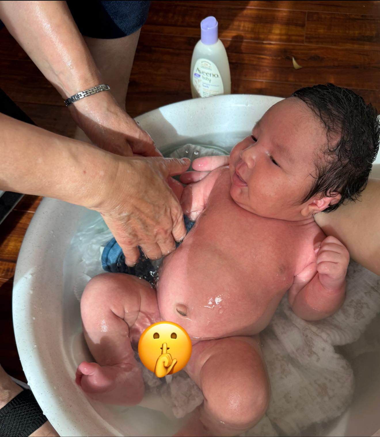 11/10/24(1w4d)臍帶掉了之後就可以幫寶寶洗澡了!這是一個星期日中午,太陽很暖,外婆買了新的澡盆給寶寶洗澡(明明我們就買了可以在浴室站著洗的大澡盆)。第一次洗澡的寶寶少不了哭鬧、但是肚子碰到水後,感覺他有種熟悉的感覺、很快的又不哭不鬧了!只是洗完澡後的寶寶,髮色居然變淡了!原本出生時是和媽媽一樣濃密的黑髮呀!但是 BIG 實在是滿意,他覺得這樣寶寶更像他一些了!