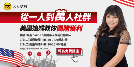 五年前因為想念台灣,我創辦了美國華人福利社,從一人到目前的六人團隊,除了獲得許多台灣廠商的支持之外,我也收到許多主婦媽咪、想增加額外收入的上班族、學生會長、教師族群等向我詢問如何才能成為團購主,賺取第二份收入。 在美國人生地不熟、也沒有任何人脈基礎,想成為台灣產品的團購主,該怎麼做呢?聽起來非常難!若之後回台灣,我還能擔任團購主嗎?這又是另一個問題! 若你對團購有興趣、想要有人手把手帶領你開團轉取第二份收入,邀請您參與我的直播,我將在這場免費直播中,獨家分享如何在海外成功開團,讓你賺錢無國界。 同時也會介紹 2023 最超值的【100天人氣團購主培訓學院】課程,讓你真正從素人實戰變成團購好手!擁有第二份穩定收如不是夢! 【免費講座訊息】講座主題:從一人到萬人社群,美國媳婦教你團購獲利!主講人:美國華人圈指標性平台創辦人/ 凱莉、個人IP 金牌超級經紀人/ Jerry 許景泰時間:3/8 台灣時間 9:30am,3/7 美西時間 5:30pm、美東時間 8:30pm形式:ZOOM 直播(本直播不提供回放)歡迎點選這裡報名!
